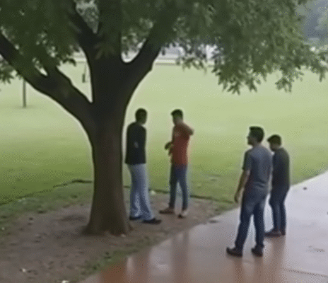 Eyewitnesses at the scene say the storm rolled in quickly. As rain began to fall, the four men—believed to be friends enjoying a walk—took cover under a large tree in the middle of the park. Moments later, a bright flash and deafening crack stunned the area as a bolt of lightning made direct contact with the tree or ground nearby.