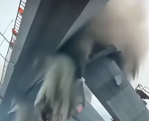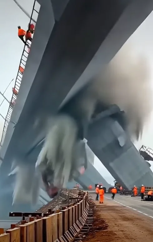 A major highway under construction shows alarming structural failure. Large cracks appear in the elevated roadway while dust and debris begin to fall. The evacuation team, dressed in orange vests and helmets, immediately begins escaping—workers on the ground run toward safety while those on scaffolding and lifts descend quickly. Cranes and construction equipment stand by as the highway shakes. The scene captures the tense, real-life urgency of trained workers evacuating before a catastrophic collapse.