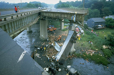 Three people were killed when their vehicles fell with the bridge into the Mianus River 70 feet below, and three were seriously injured. Collapse due to failure of the Pin and Hanger assembly supporting the span.